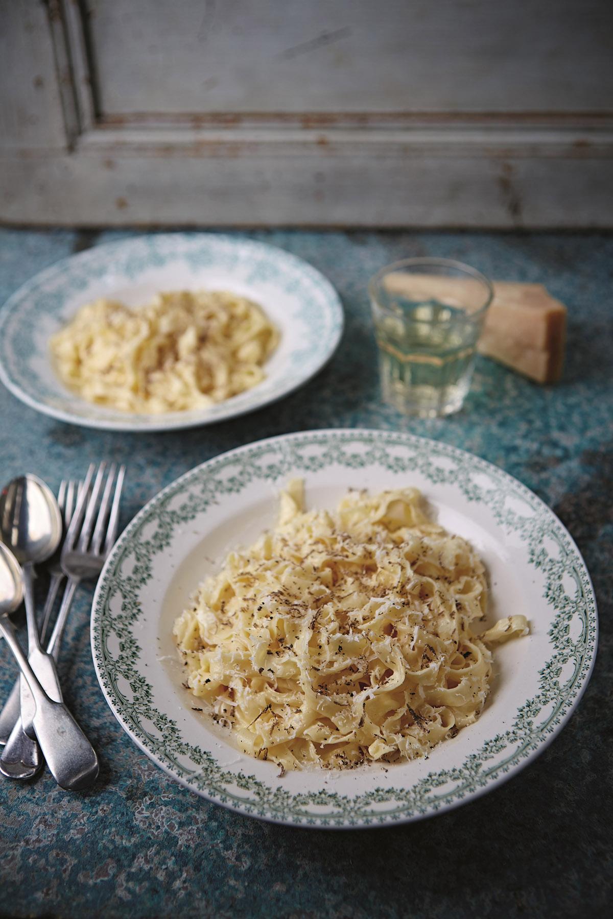 Doe met een keukentang de pasta met aanhangend water rechtstreeks in de pan saus. Hussel alles goed door elkaar en doe er zo nodig een extra scheutje kookwater bij om er een fluweelzachte saus van te maken. Schep de borden vol, rasp er een klein beetje truffel of nootmuskaat en een flinke rasp Parmezaan over, sprenkel er een paar drupjes truffelolie op en ga meteen aan tafel.