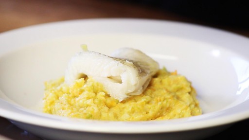 Haal de vis van de groenten af en leg hem opzij, de vis is klaar als hij uit elkaar valt. Haal de pan van het vuur en pureer alle groenten in een blender tot een zachte puree. Schep de puree op een bordje en serveer het met een stukje vis, check nogmaals of er geen graat in de vis zit. Smullen!