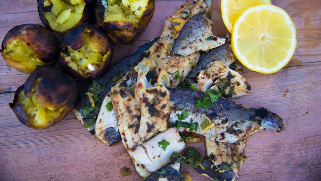 Bak de vis op de gril/barbecue gaar, beginnende op de huid zodat die mooi krokant wordt.