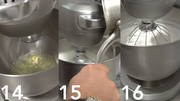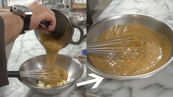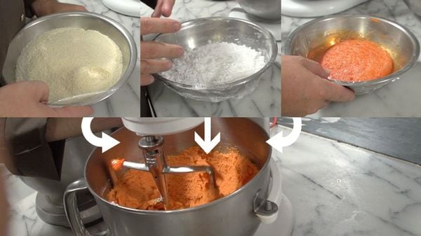 Nu begint het echte werk: de daadwerkelijke macarons. Meng het amandelpoeder met de eiwitten, oranje kleurstof en poedersuiker met een mixer. Zet het mengsel apart en begin met de meringue door suikersiroop te maken met het water en suiker, breng dit aan de kook onder voortdurend roeren en zorg dat het 120 graden wordt.