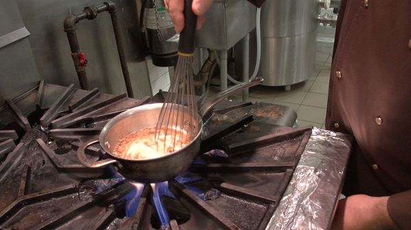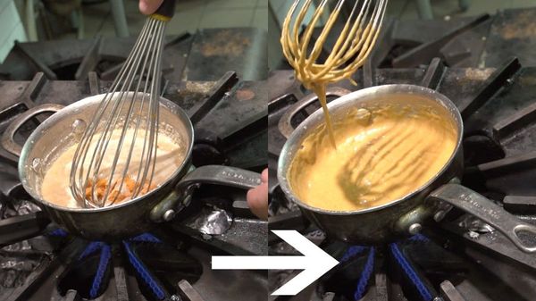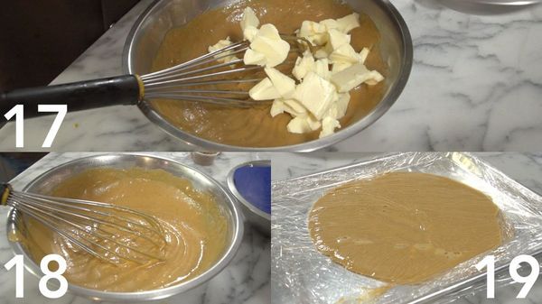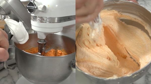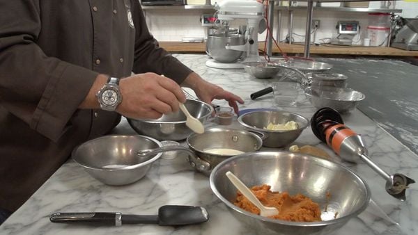 Als het mengsel eenmaal wat dikker begint te worden is het tijd om de pompoenpuree toe te voegen, mix ook dit weer goed en breng aan de kook. Doe de witte chocolade in een schaal en voeg hier het nog warme mengsel toe, hierdoor zal de chocolade smelten. Zorg dat ook hier geen klontjes in komen en laat afkoelen tot 40 graden.
