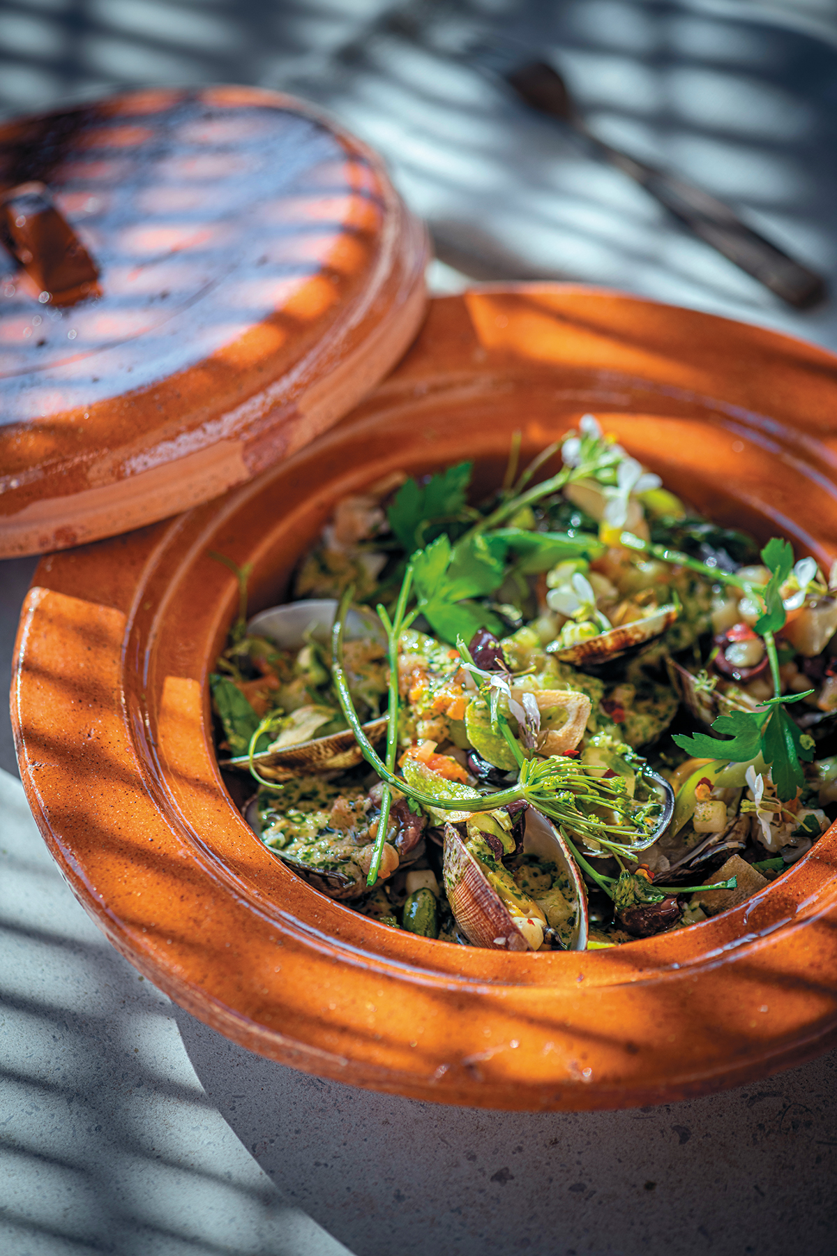 Sergio: “Fregola komt oorspronkelijk uit Sardinië. Toch eet ik deze pastasoort vaak als ik op Formentera ben, want daar wemelt het van de Italianen en de Italiaanse restaurants. Ook heb ik het standaard in huis, want het is enorm veelzijdig; je kunt het serveren als couscous of pasta, warm of koud. In dit geval heb ik een combinatie gemaakt met een van mijn grote Spaanse favorieten: almejas a la marinera.”