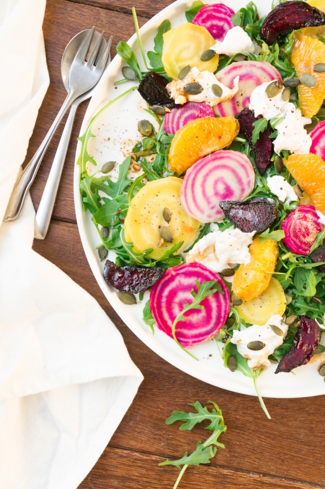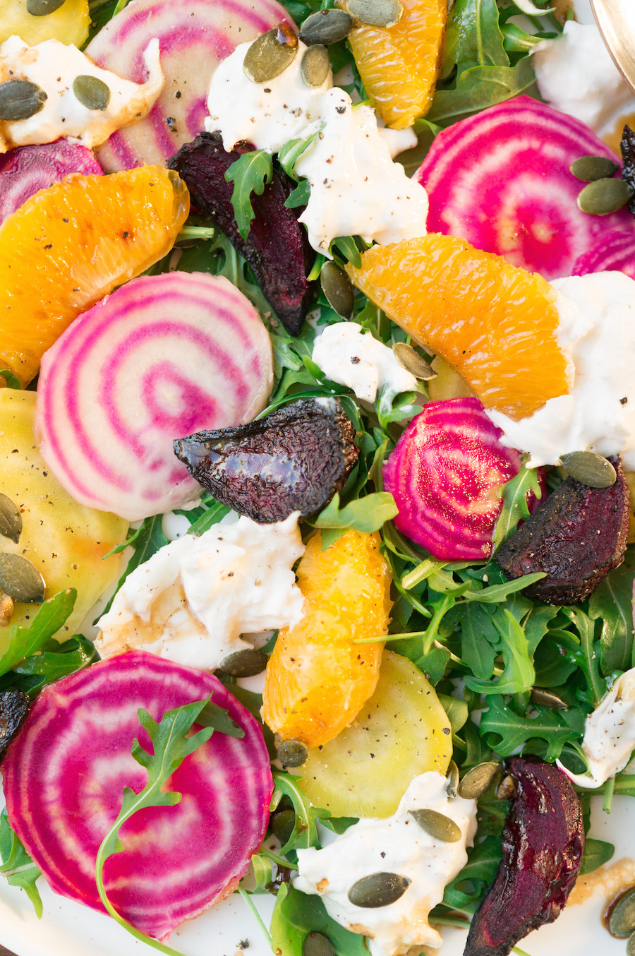 Schik op een bord de rucola, bieten, stukjes burrata, partjes sinaasappel en pompoenpitten. Sprenkel er wat van de dressing overheen en val aan.