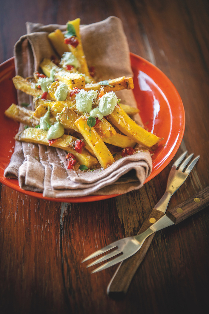 Sergio: “Bij Frites Atelier hadden we ooit een patatje met basilicummayonaise, tomatenpoeder en Parmezaanse kaas op het menu. Zodra we het van de kaart haalden, werden we overspoeld met e-mails en telefoontjes van klanten die de basilicummayo zo misten. Gelukkig kun je dezelfde smaakcombinatie thuis ook maken.