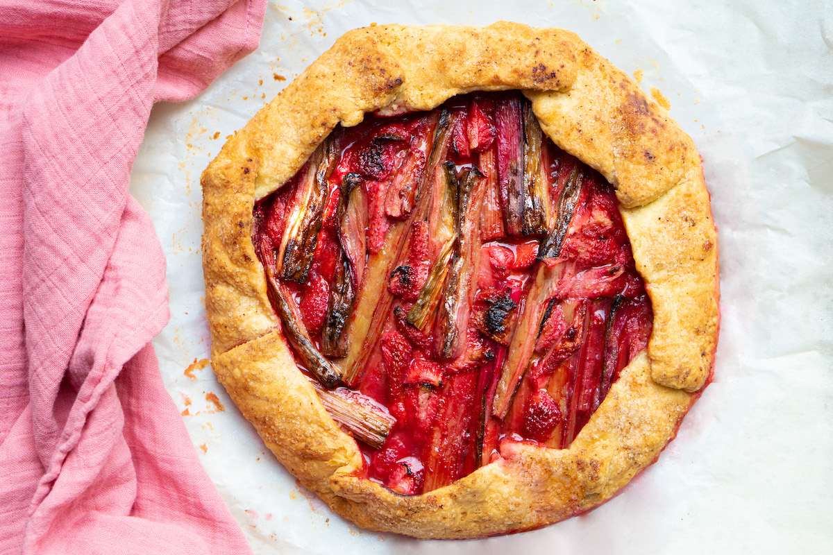 Een galette is een rustieke, zeg maar stoere taart. En dat komt goed uit, want dat betekent dat je niet zo hoeft te frutselen en friemelen. Voor de galette geldt eigenlijk: hoe rommeliger, hoe beter. Want het gaat om de smaak. In deze galette met rabarber en aardbeien draait het dan ook helemaal om boterig, kruimelig deeg, friszure rabarber en zoete aardbeien.