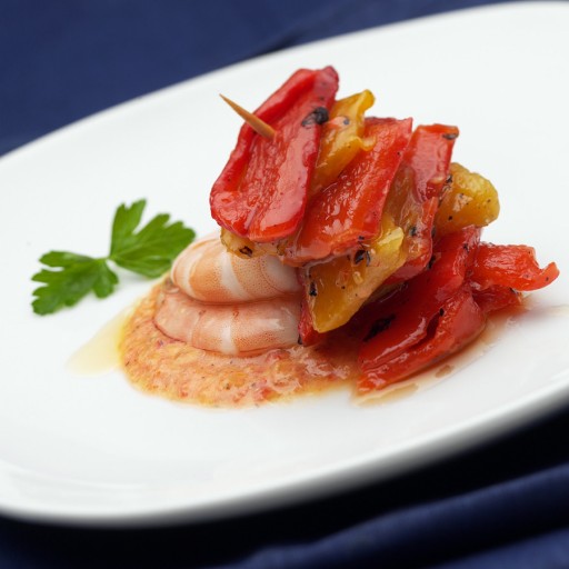 Deze prikkers met gamba’s en gegrilde paprika is perfect als amuse, snack of voorgerecht.