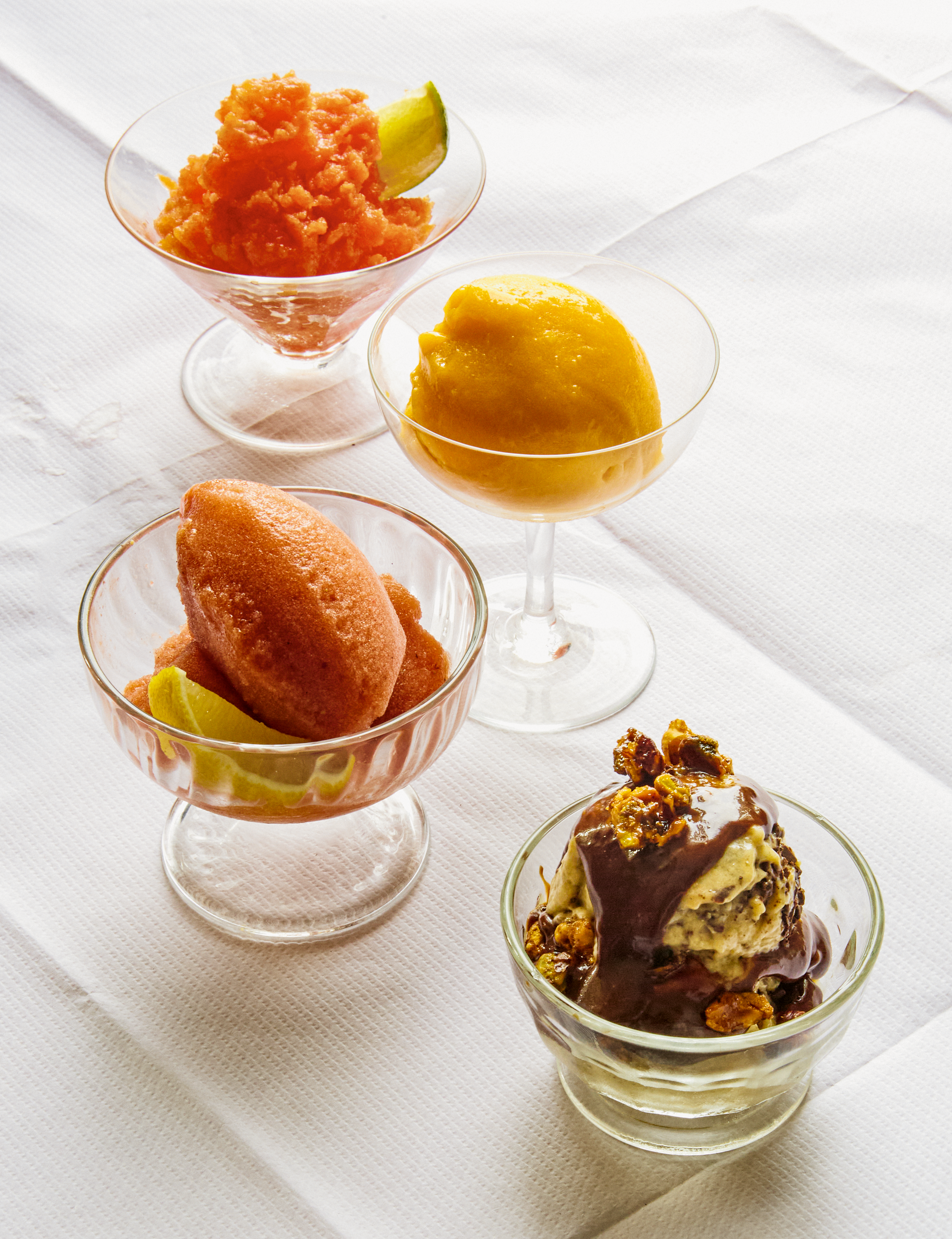 Dat doet ze met gerechten als zoete aardappelgnocchi met gekruide aubergine-ragout en snelle biefstuk met koffie en chiliboter, maar ook met dit te gekke dessert van gebakken-bananenijs met choc-fudgesaus (rechtsonder op de foto).