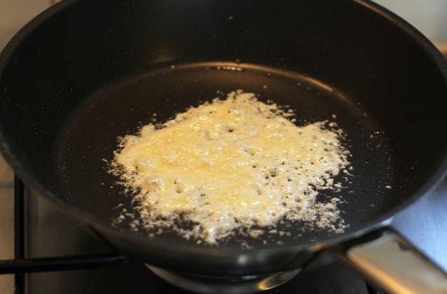 Strooi de kaas in de pan in een cirkel, ongeveer 10-15 cm in diameter (uiteraard komt dit totaal niet nauw!). Laat ongeveer 1 minuut op medium vuur bubbelen (als het te hard gaat, zet het vuur dan wat lager).