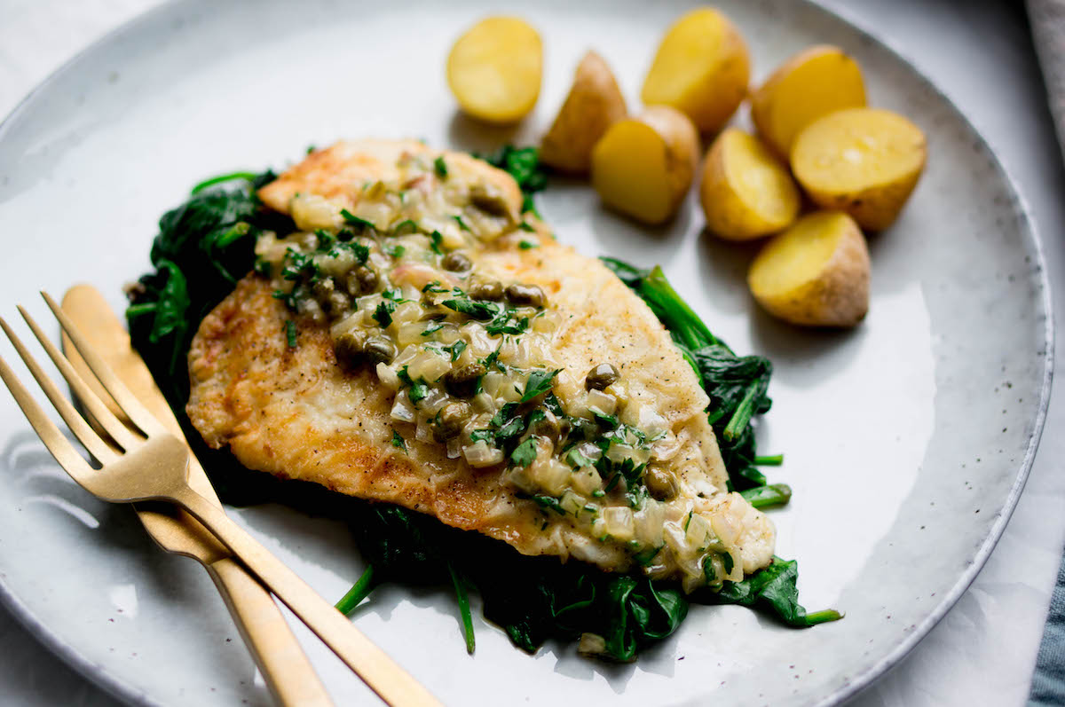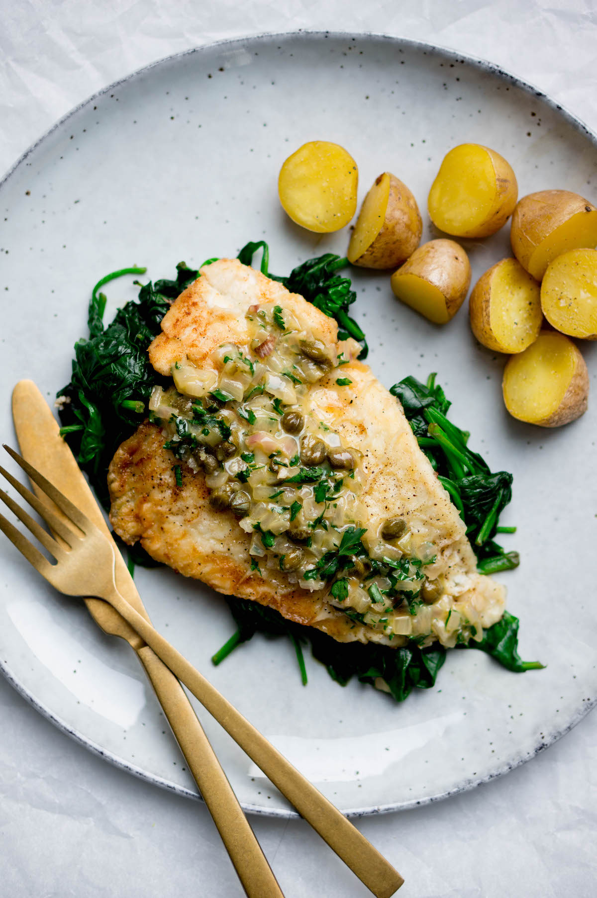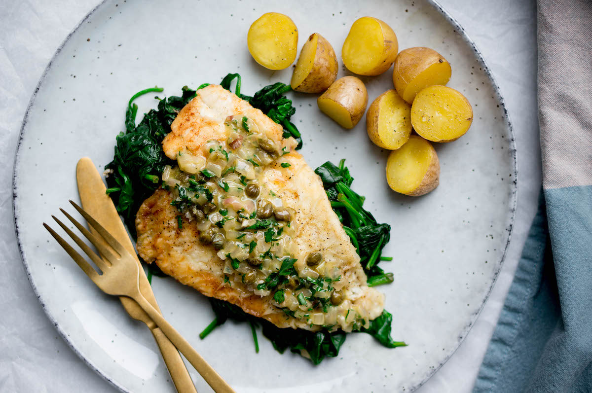 Gebakken schol met spinazie, krieltjes en tartaarsaus