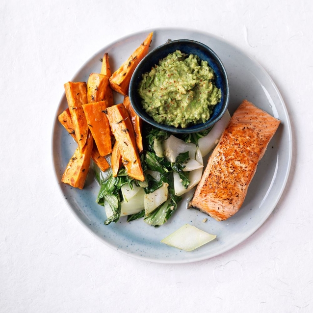 Elke week delen we een lekker recept van onze vrienden van ZTRDG.NL. Deze keer: gebakken zalm met avocado dip, roergebakken paksoi en geroosterde zoete aardappel.