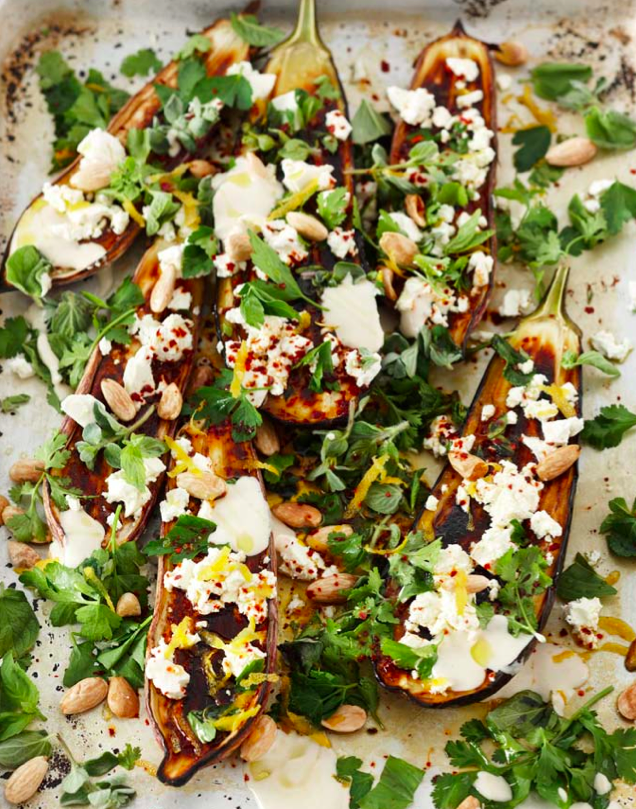 Aubergine met tahina is nog zo’n liefdevol huwelijk dat al jaren standhoudt. De combinatie van aubergine met de frisse groene kruiden, het citroenrasp, de knapperige amandelen en de romige kaas is niet te weerstaan. Geweldig op een Arabia-buffet of als lunchgerecht.