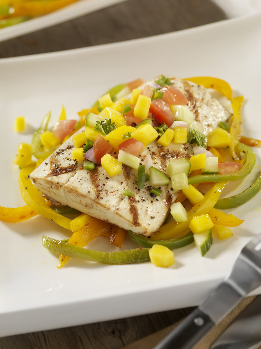 Haal de filets uit de zakjes en haal voorzichtig met je handen de marinade ervan af. Vet een grilpan of barbecue lichtjes in met een beetje olijfolie en gril de filets 6-10 minuutjes, halverwege kerend.Ā Serveer de vis met de mangosalsa.