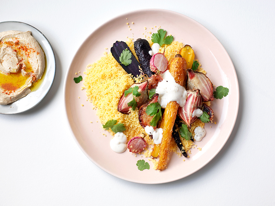 “Deze bijzondere couscous is gemaakt van mais en rijst en is van nature glutenvrij. De groenten worden boterzacht en zoet als je ze in de oven gaart. Lekker met een fris yoghurtsausje en hummus, maak hem zelf of kies voor gemak en bestel ‘m kant en klaar.”