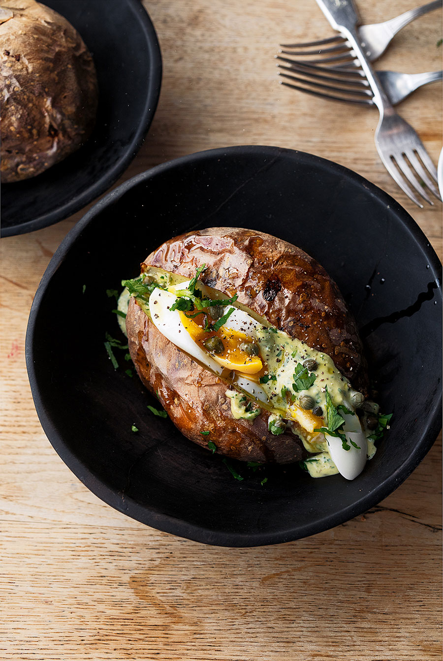Yotam: “Dit is een combinatie van twee heel eenvoudige en troostrijke gerechten: een gepofte aardappel en een zachtgekookt ei. Als u het gerecht nog iets voedzamer wilt maken, kunt u wat extra tonijn door de saus scheppen voor u de aardappels ermee vult. Als vooruit wilt werken, kunt u de saus een dag van tevoren maken en hem in de koelkast bewaren.”