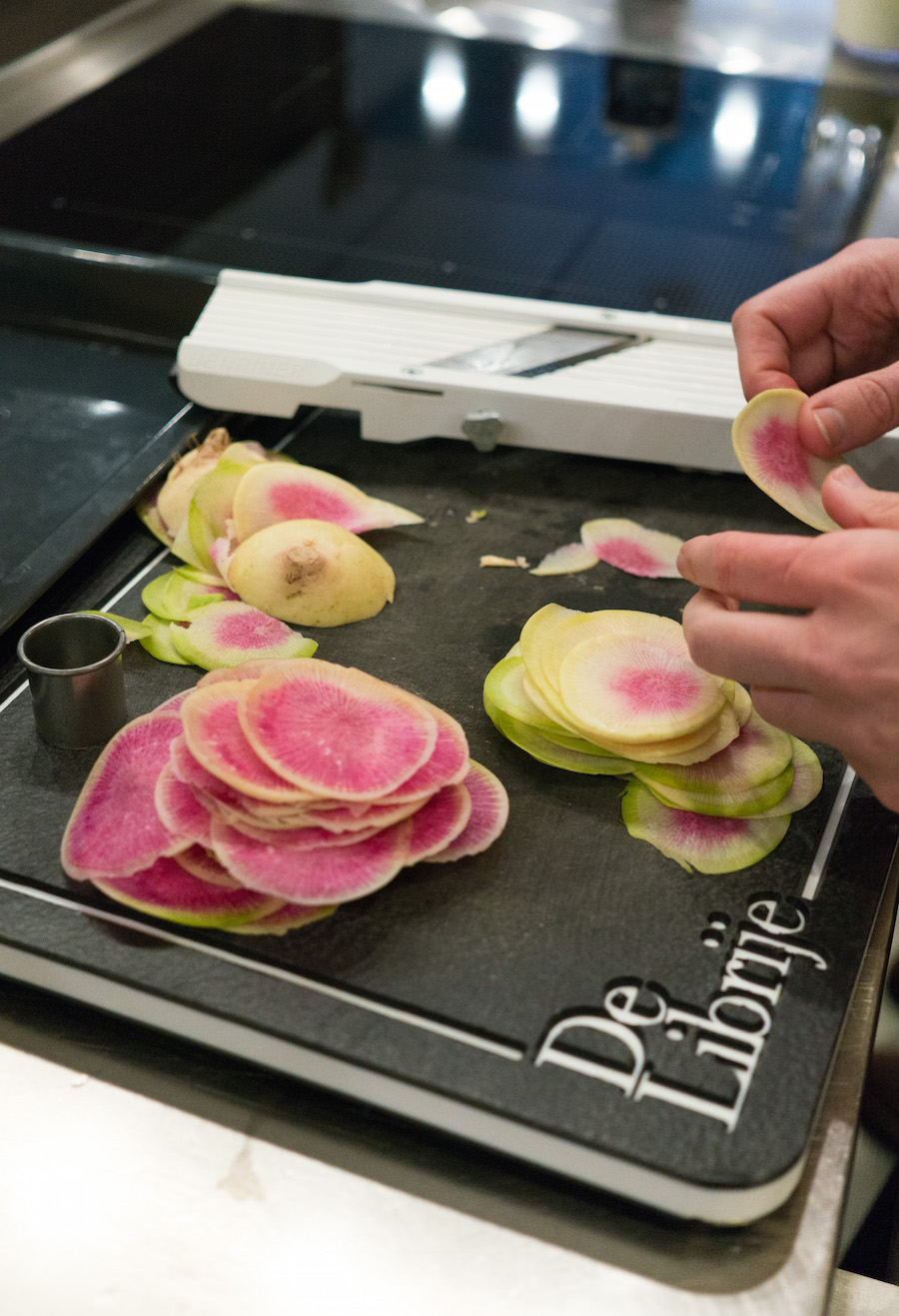1. Snijd de radijs flinterdun op een mandolie.
