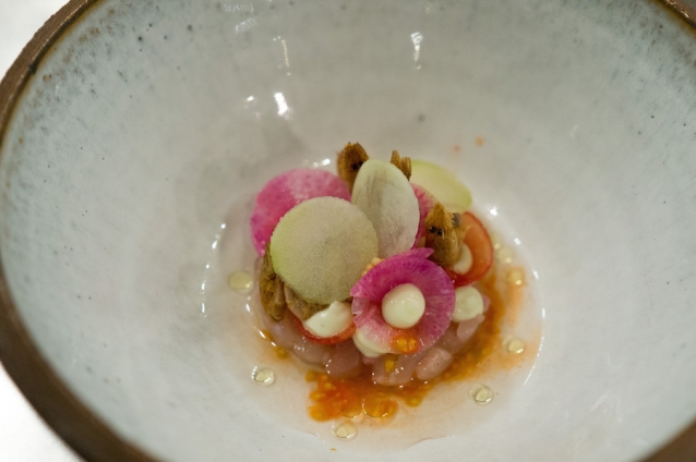 Maak met behulp van een steker een hoeveelheid tartaar op het bord. Zet hierin de kegeltjes van de radijs. Zet ook op en naast de tartaar stippen van de crème. Leg twee cherrytomaatjes op het gerecht en vul ze met mosterdzaad en een stipje crème. Zet in het kegeltje een bolletje tomatenzaad. Zet ook de koolrabi in het gerecht en maak af met een lepel tomatenbouillon.