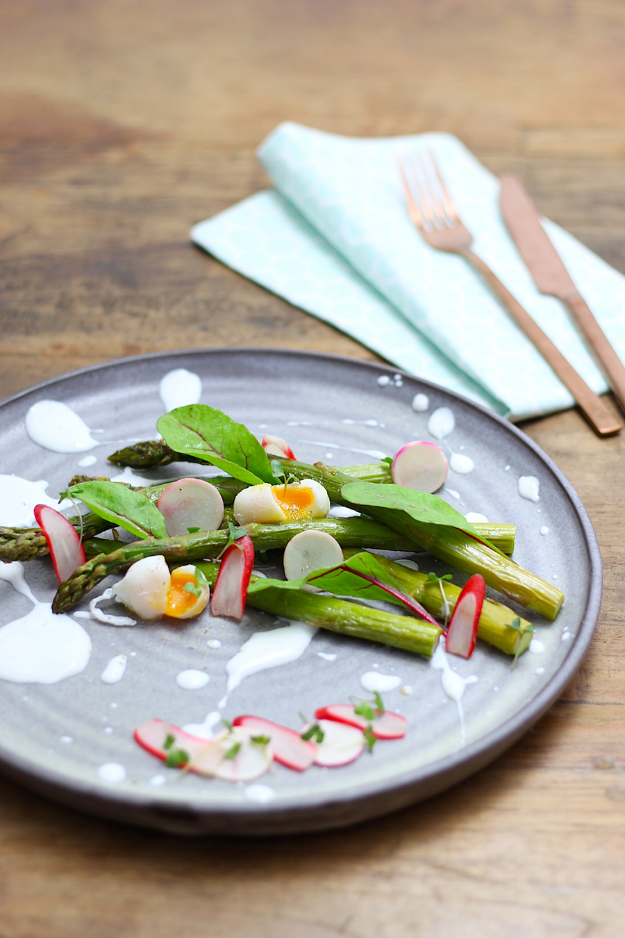 Geroosterde asperges met gemarineerde voorjaarsgroenten en citroen-geitenyoghurt