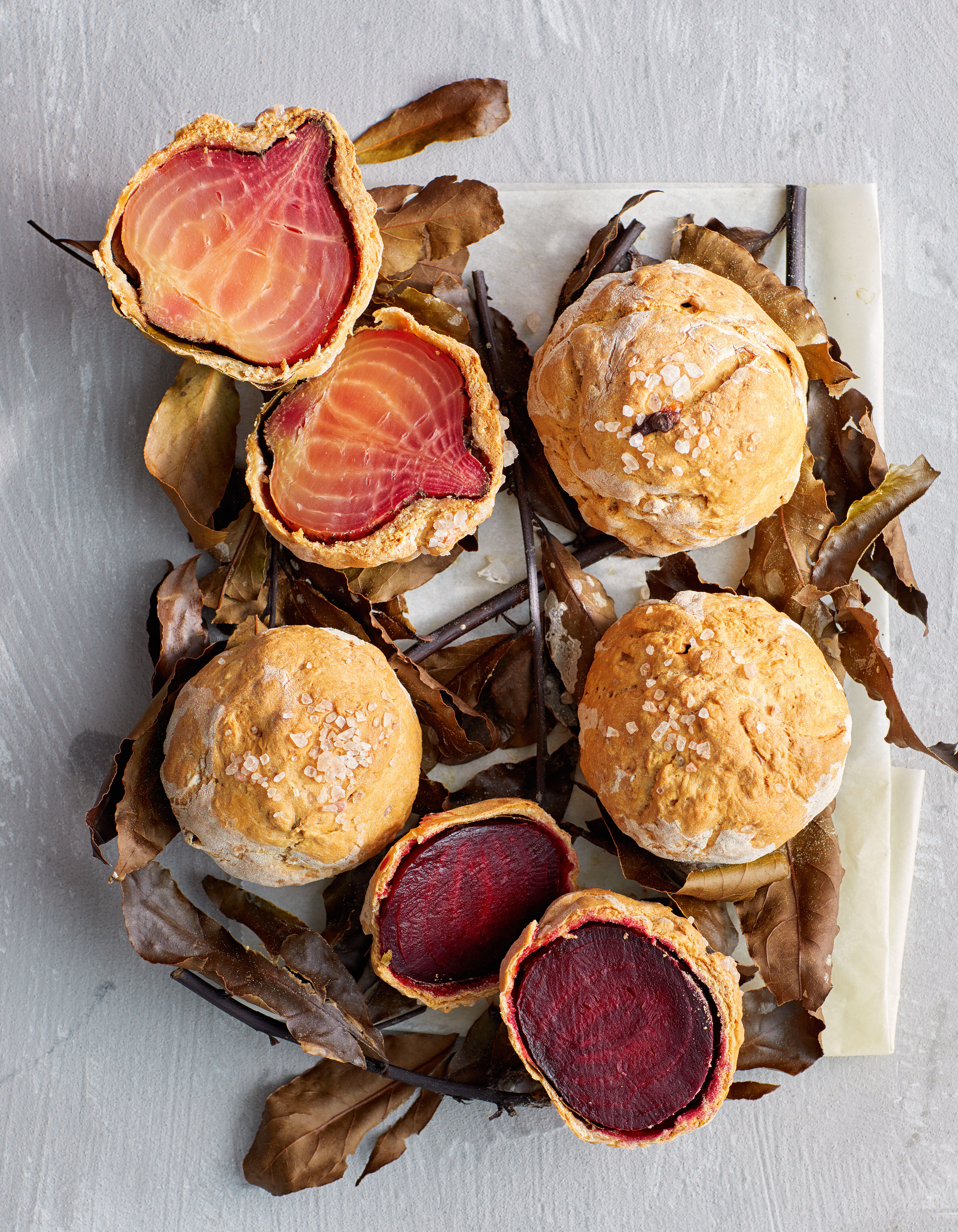 Maak de bovenkant van elk deegbolletje een beetje vochtig met wat water en strooi er wat grof zeezout op. Bak de bietjes in het midden van de oven in circa 2 uur goudbruin, gaar en knapperig.