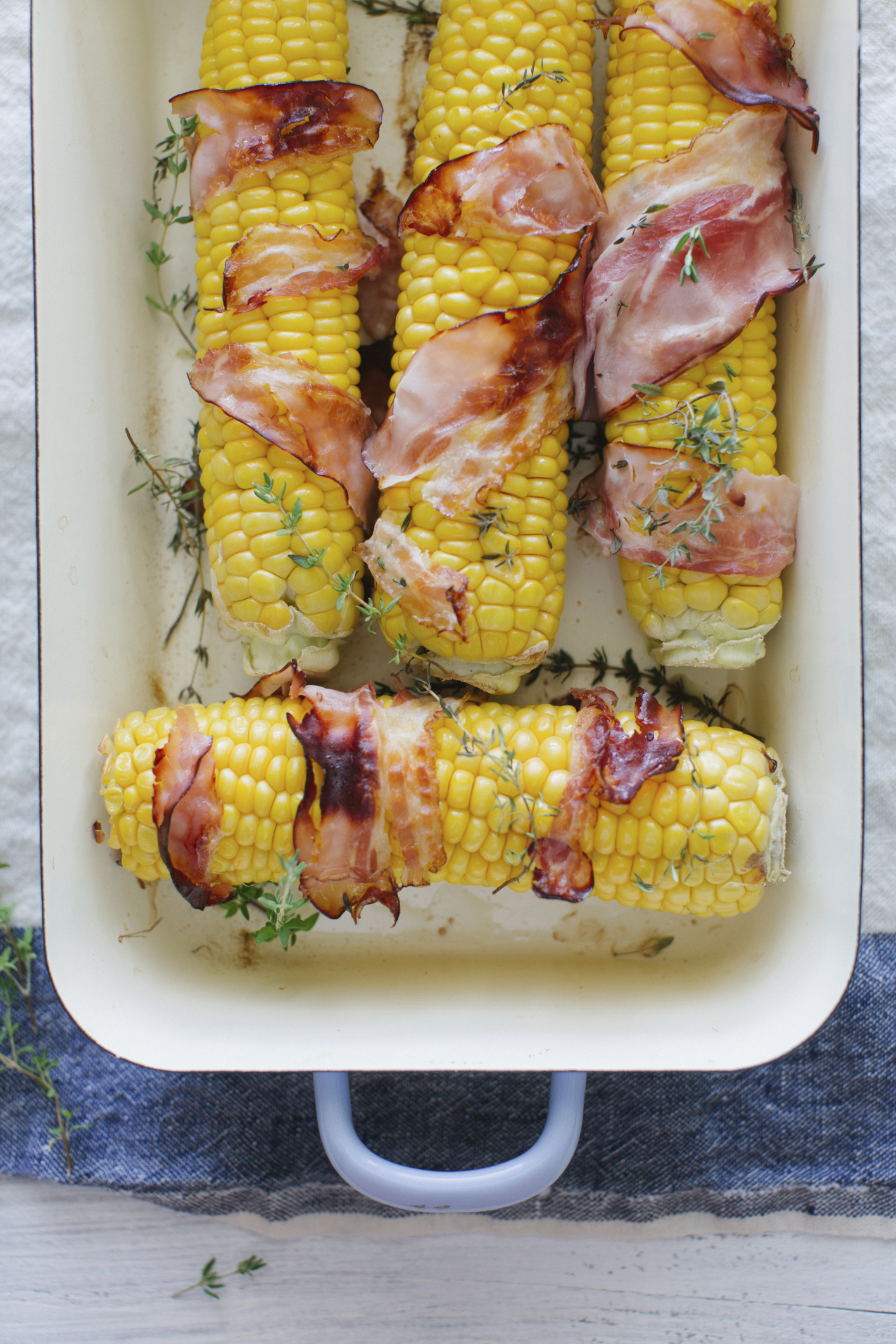 Leg de maïskolven op een bakplaat of in een ovenschaal en besmeer met de boter. Drapeer de bacon eroverheen en besprenkel met de takjes tijm.