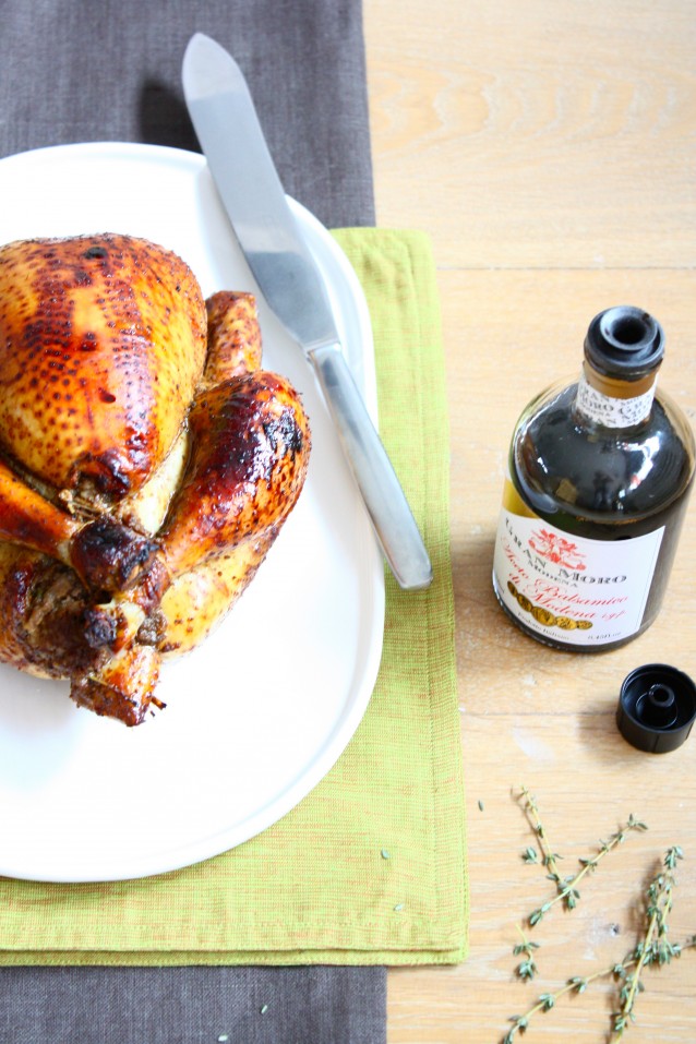 Zet de kip 10 minuten in de oven op 225 graden en draai daarna de temperatuur terug naar 180 graden. Op deze temperatuur bak je ‘m nog 20 minuten. Haal halverwege het bakblik uit de oven en glaceer nogmaals met balsamico. Na 20 minuten zet je de temperatuur terug naar 120 graden, laat het deurtje van de oven even openstaan om de warmte eruit te laten. Op dat moment dek je het bakblik af met aluminiumfolie. Zet de kip nog 60 minuten in de oven op deze temperatuur.