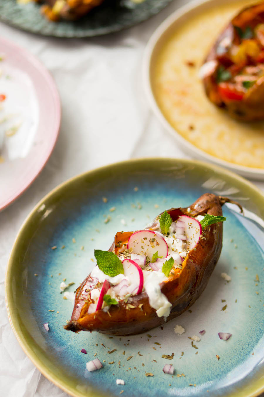 Naast feta en tzatziki voegden we ook nog plakjes knapperige radijs, gedroogde oregano, wat verse munt en rode ui toe aan onze gepofte zoete aardappel. Maar je kunt je ook helemaal uitleven met wat je nog in huis hebt. Denk bijvoorbeeld aan verse oregano, zwarte olijven, blokjes tomaat enzovoorts. Het is jouw feestje.