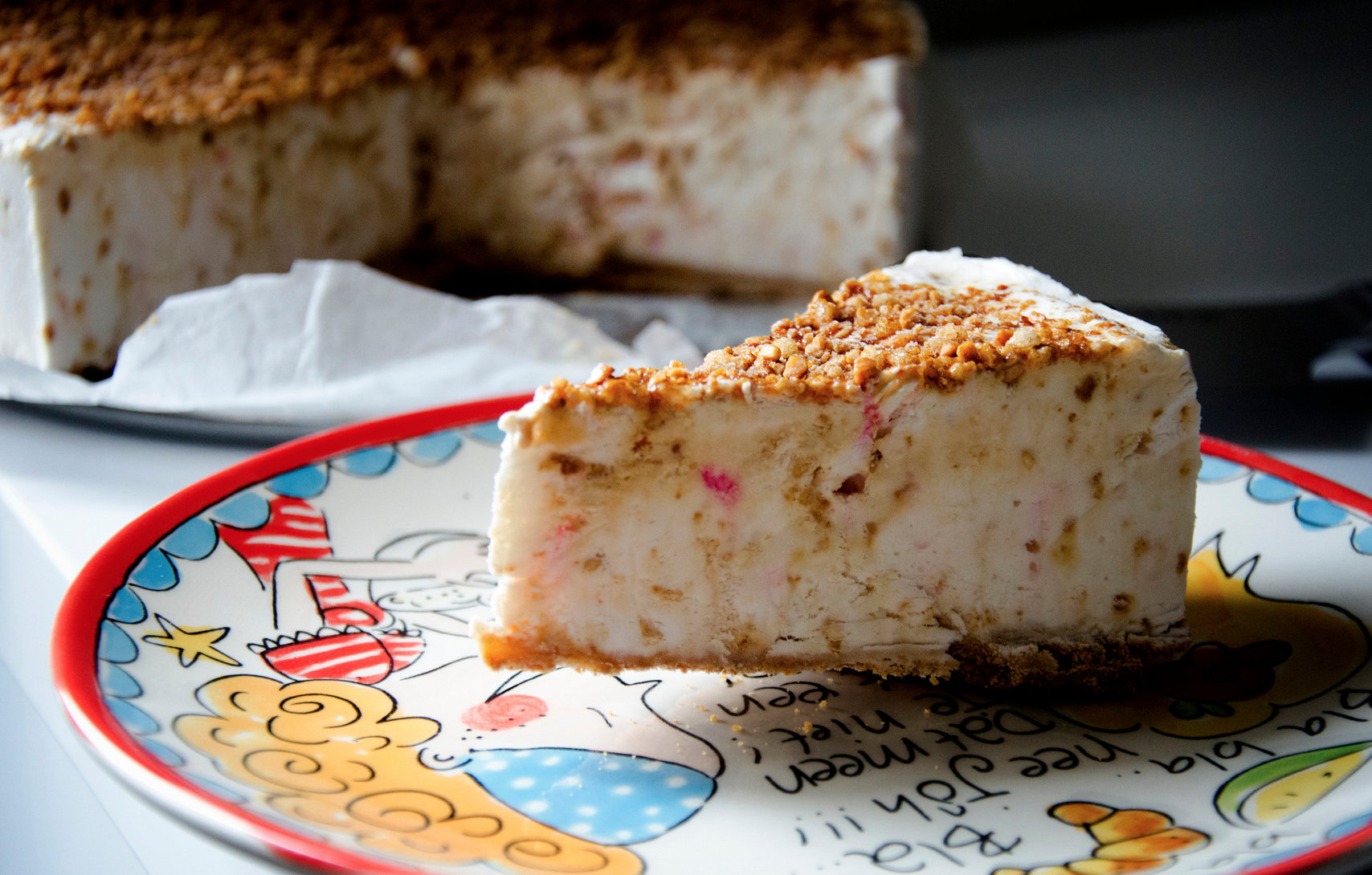 Pak je springvorm, en giet het slagroommengsel op de opgesteven bodem. Verdeel netjes met een spatel (en eventueel een paletmes voor een strak resultaat) en decoreer met de overgebleven nougatine*. Laat de taart een nacht opstijven in de vriezer.