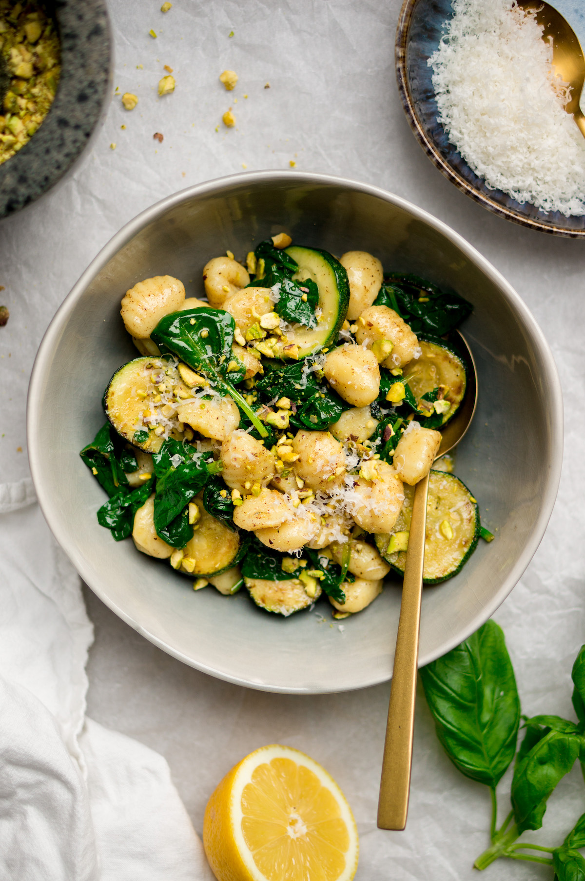 Dien de gnocchi met courgette op met een handje verkruimelde pistachenoten en wat geraspte Parmezaanse kaas.