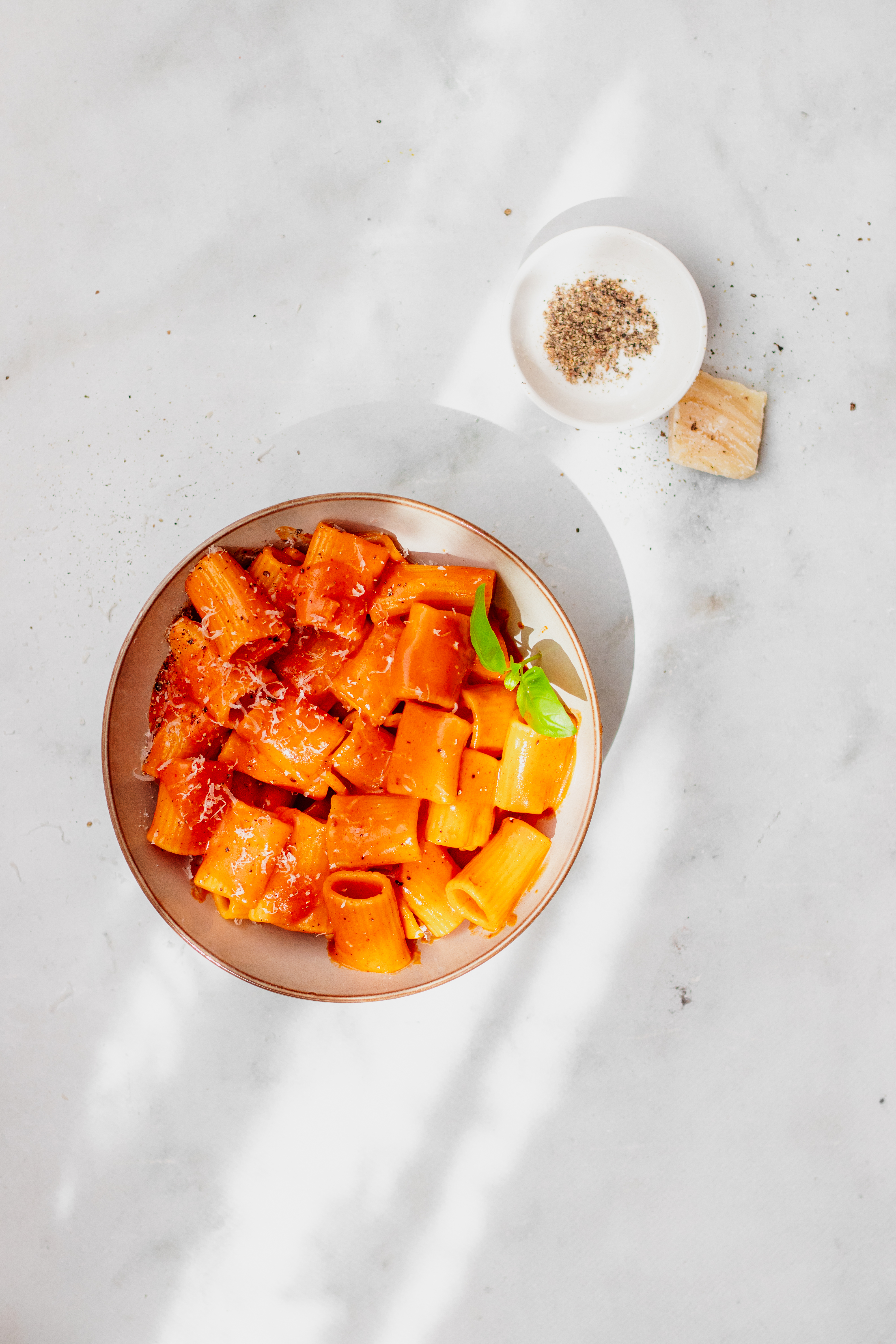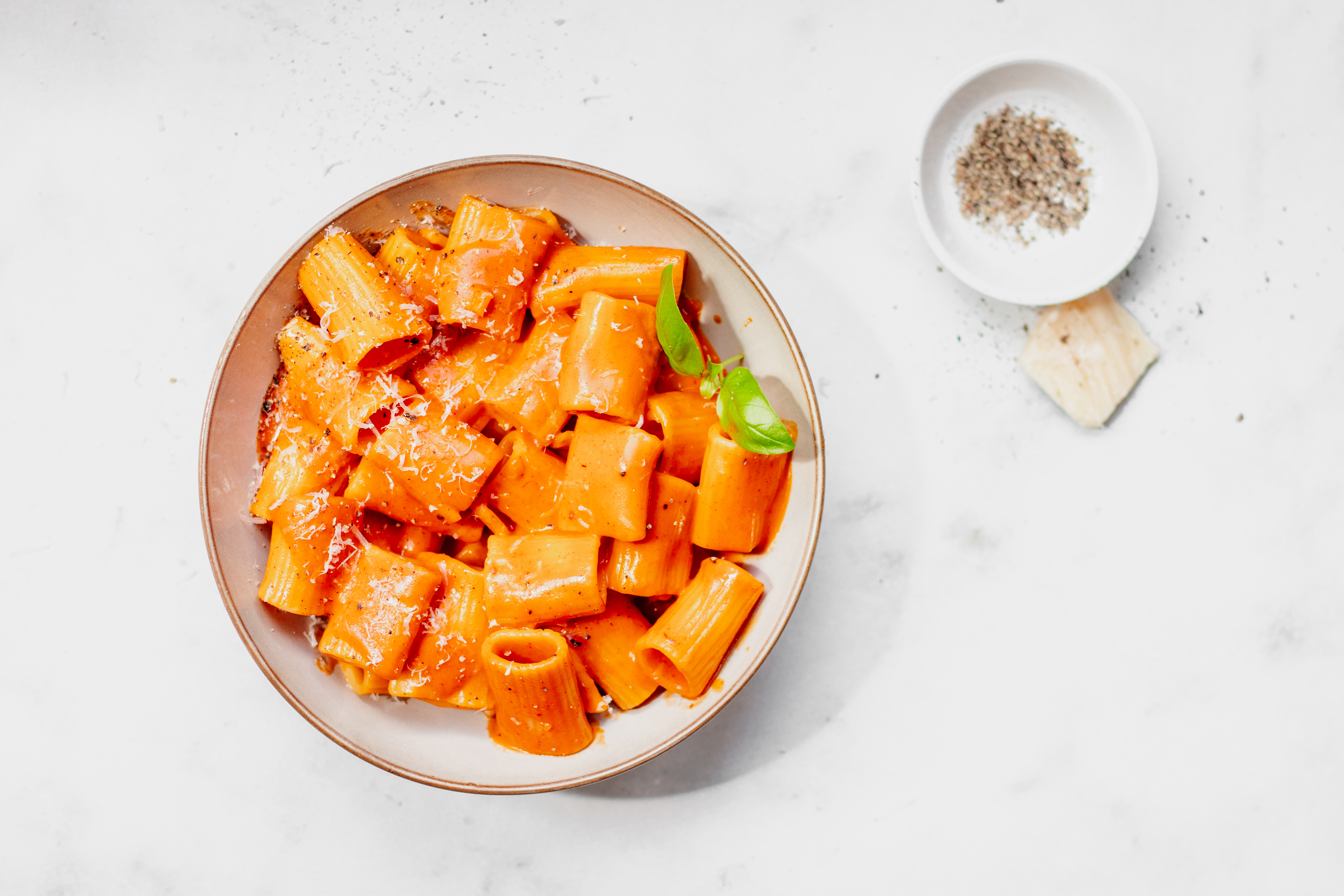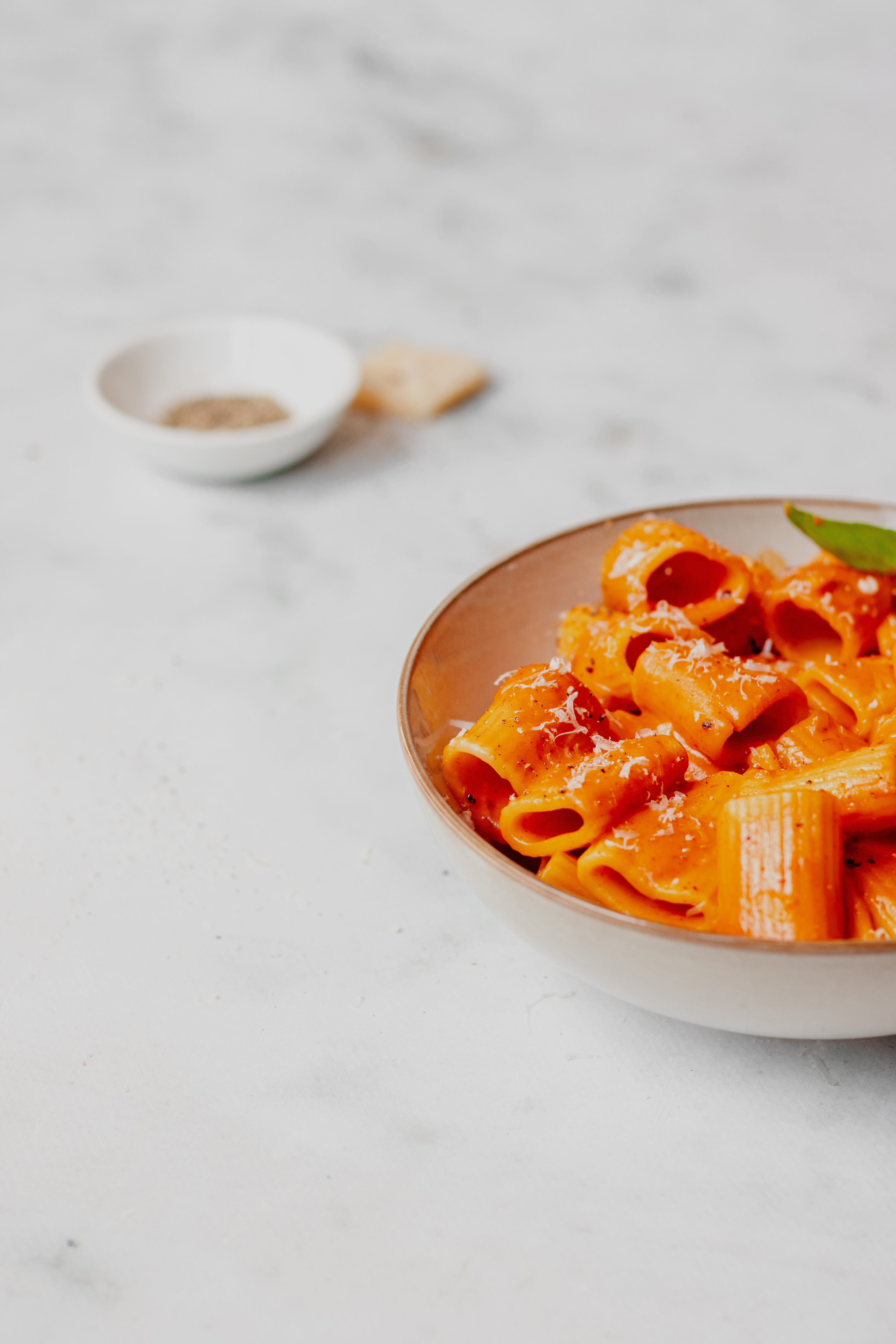 - Breng een pan met ruim gezouten water aan de kook en kook de rigatoni al dente. Schep er een kopje pastawater uit, zet dat apart.