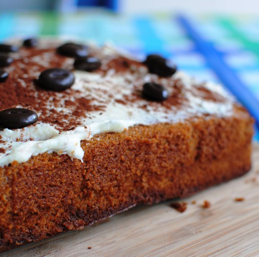 Haal de cake uit de oven en druppel er de koffie over. Meng de roomkaas met de poedersuiker en bestrijk hiermee de cake. Bestuif met cacaopoeder en decoreer met chocoladekoffieboontjes.
