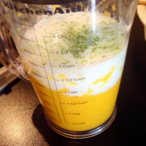 Doe de stukjes geschilde mango, de zest, het sap en de kokosmelk bij elkaar in een blender en mix goed door. Schenk in mooie (Martini)glazen en garneer met een aantal blokjes mango. Je kunt het mengsel ook in een plastic ijsbak gieten, in de vriezer zetten en elk kwartier goed doorroeren met een garde. Zo heb je na een paar uur prachtig ijs.