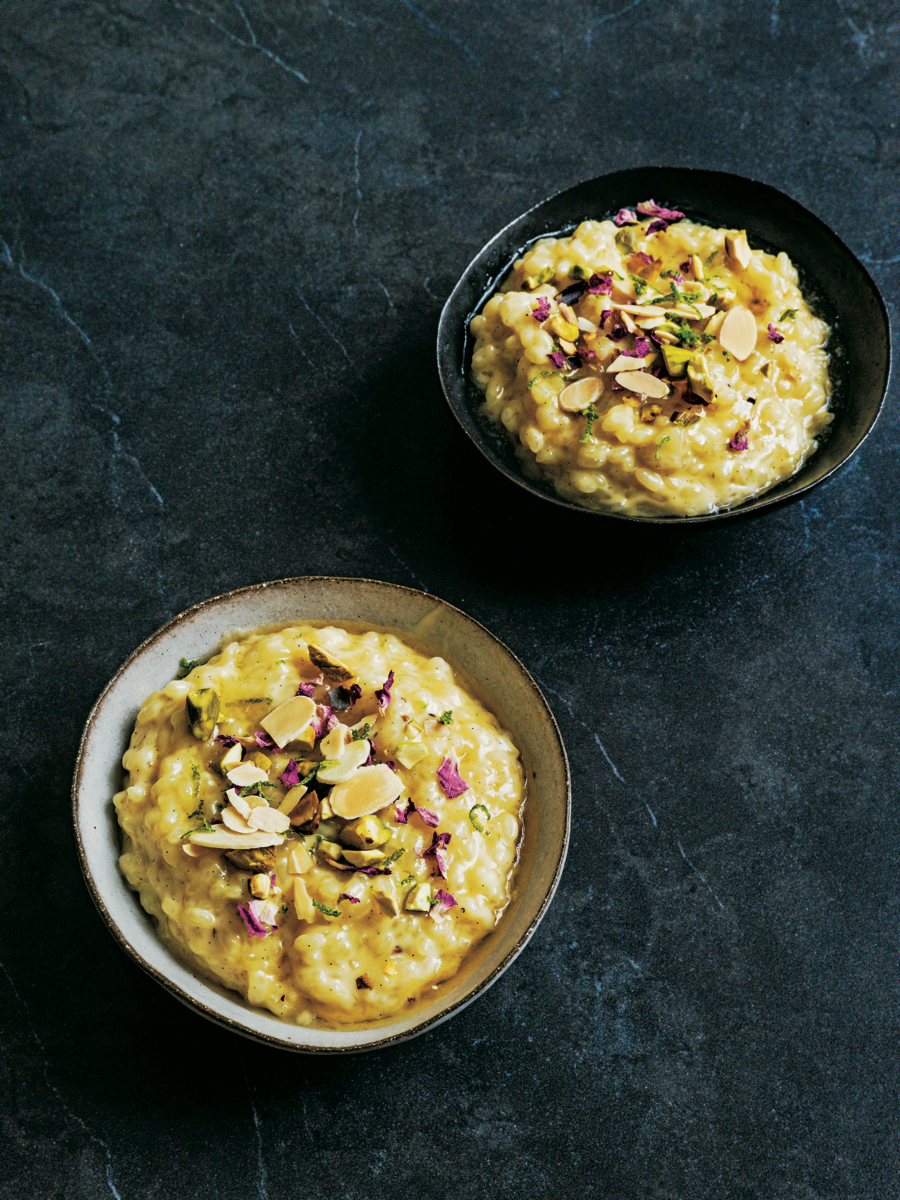 “Wij noemen rijstpudding sheer berenj, wat ‘melkachtige rijst’ betekent. Hoewel ik er als kind nooit echt dol op was, heb ik het als volwassene herontdekt en mijn eigen smaken eraan toegevoegd. Ik maak het om mezelf op te vrolijken en mezelf te troosten, want daar is een goede rijstpudding voor bedoeld. Ik voeg graag citrusschil toe aan mijn gerechten: het geeft een frisse geur en smaak zonder zuur te zijn. De noten maken dit gerecht lekker krokant.”