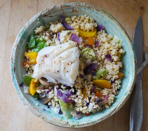 Schep de bulgur op de sla en strooi het uitje met de champignons eroverheen. Snijd de abrikozen klein en strooi over de bulgur. Leg de kabeljauw op de bulgur en strooi er eventueel een beetje zout en peper overheen.