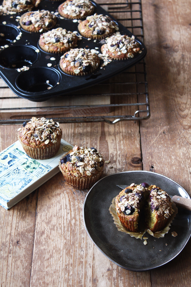 Vul dan de papieren cups met het beslag en bestrooi ruim met de granola en bosbessen. Zet de muffin tin in de oven voor ongeveer 18-20 minuten of totdat je er een saté prikker schoon uit kunt halen. Deze muffins zijn heerlijk als ze nog warm zijn. Geniet ervan.