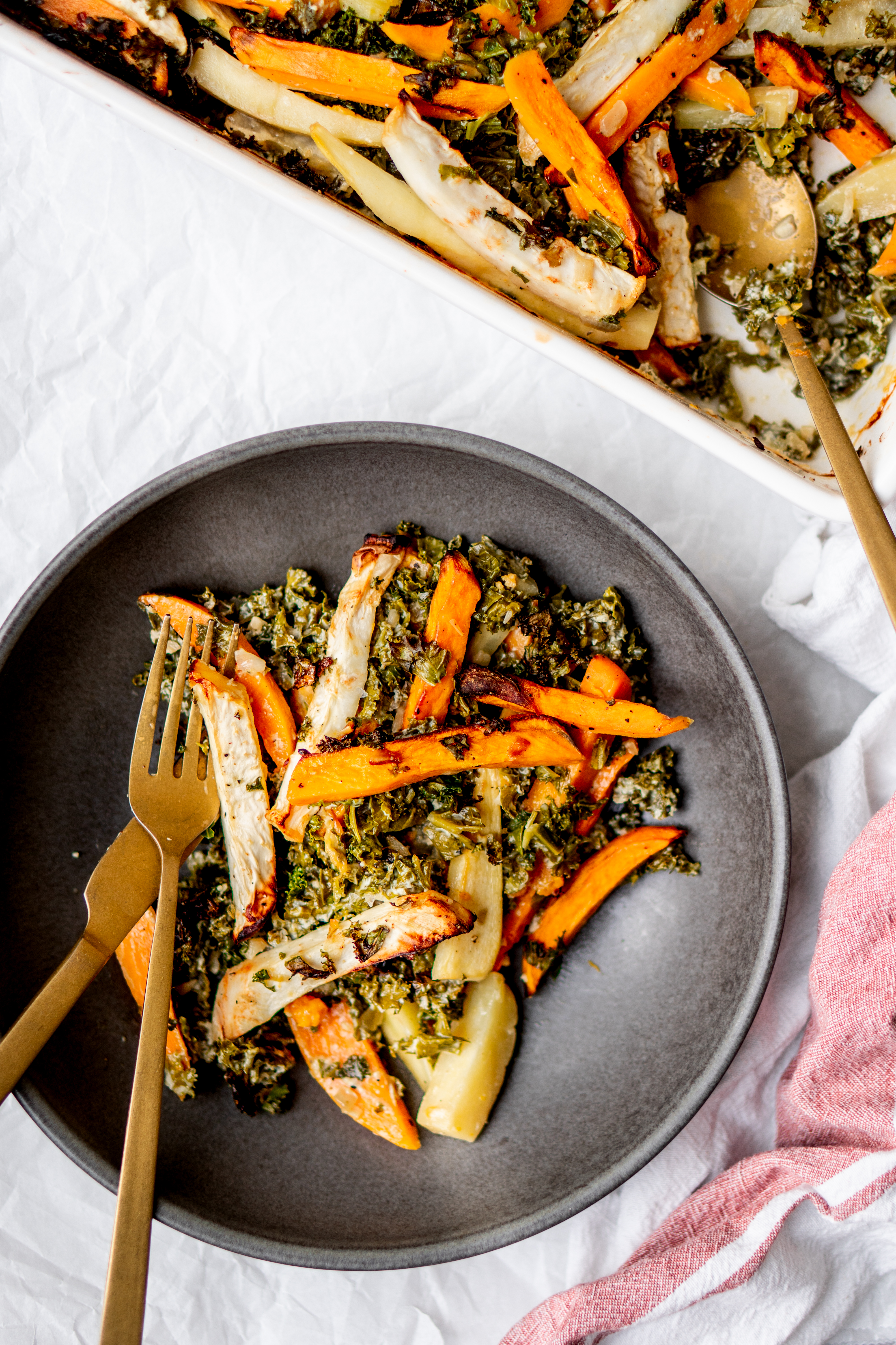 Daarnaast is het ook nog eens een vitaminebommetje waarin je alles uit je groentela kwijt kunt. Wij gingen voor pastinaak, knolselderij, zoete aardappel en boerenkool. Maar je kunt er natuurlijk ook wortels, koolraap, aardpeer of andere veggies in stoppen.