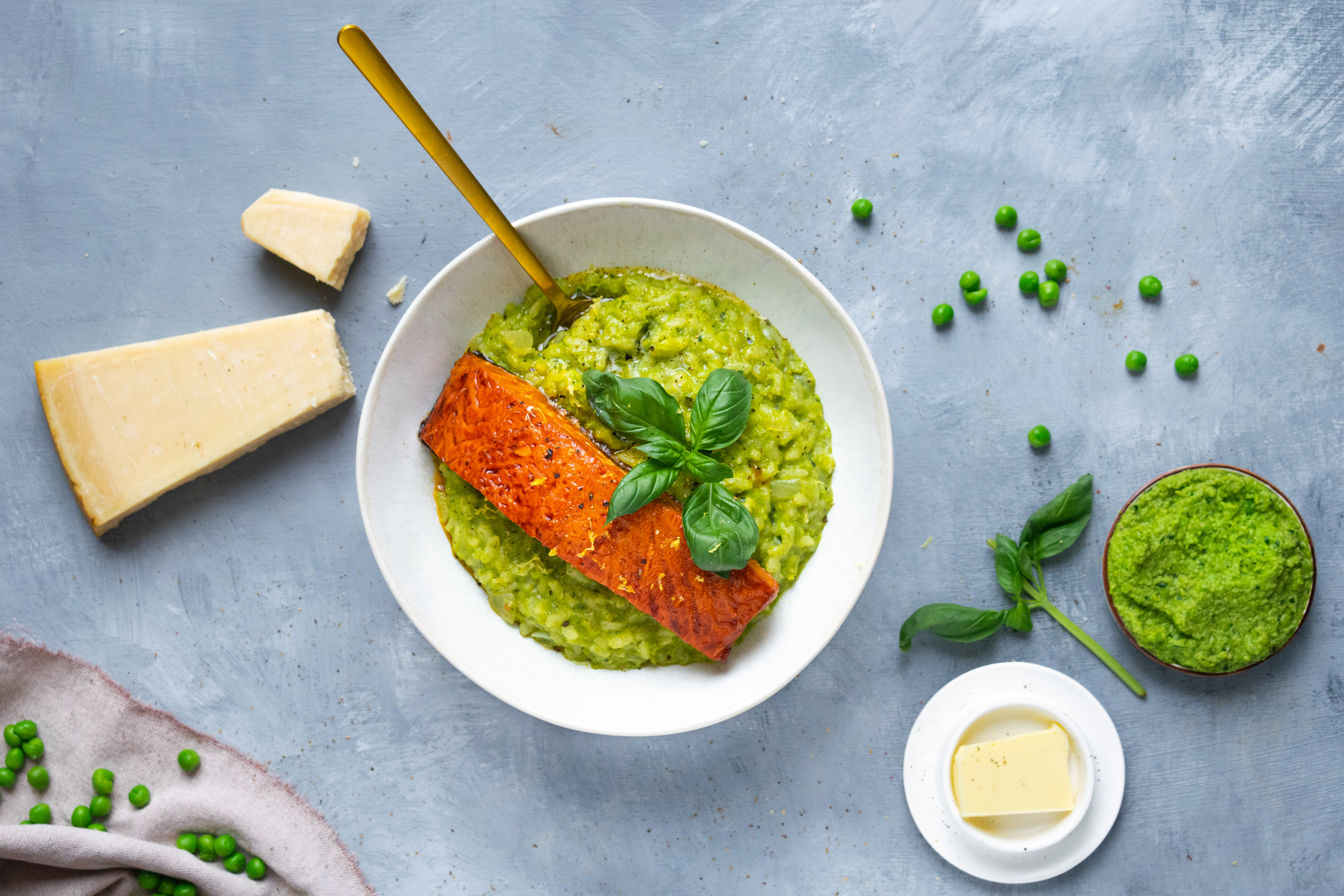 Deze risotto heeft zijn kleur te danken aan een puree van tuinerwten en groene kruiden die je in een handomdraai in elkaar draait – makkelijker kan eigenlijk niet. Serveer daar een stukje zalm bij en je wint ongetwijfeld extra respect bij je huisgenoten. Wedden?