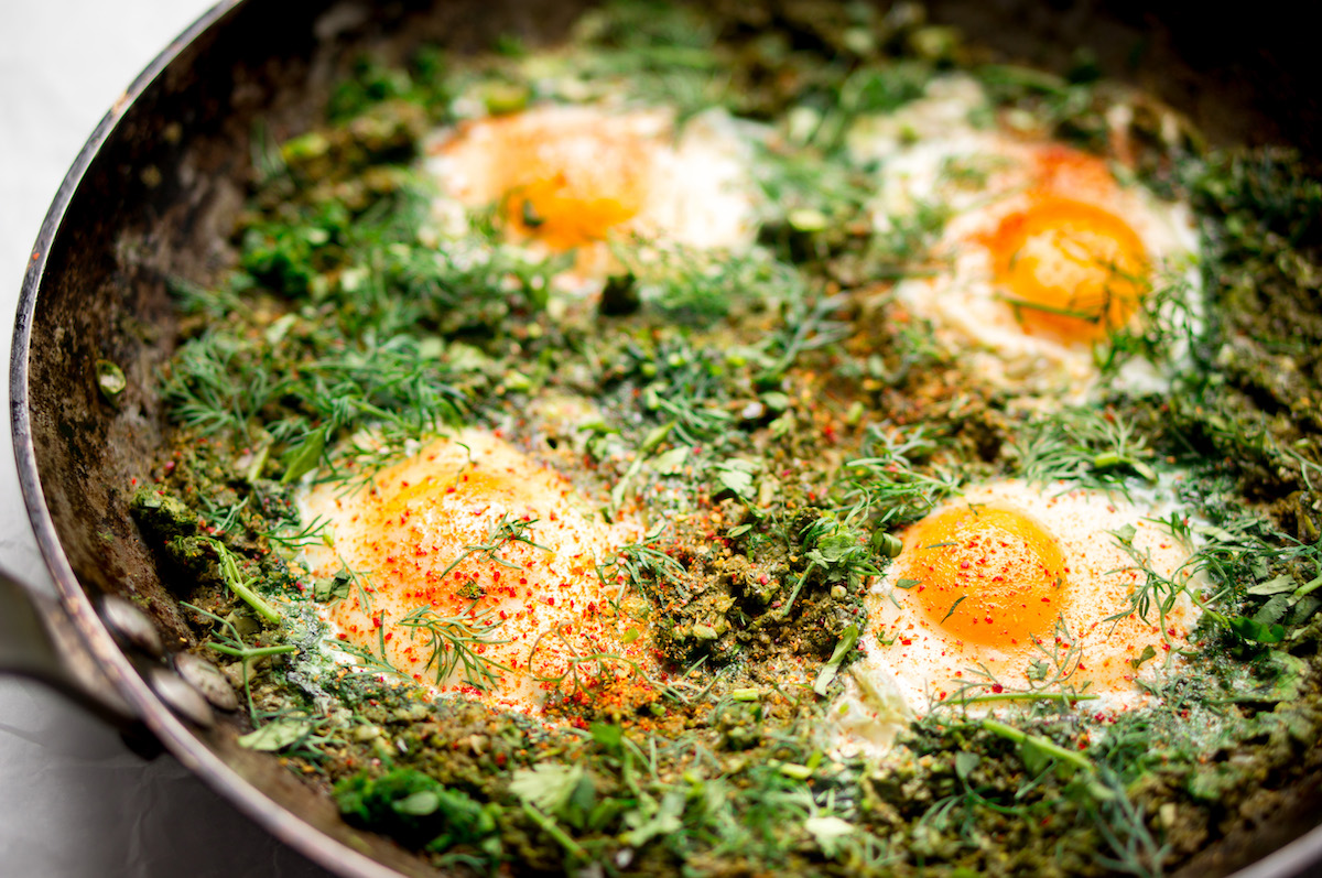 Garneer de groene shakshuka met wat takjes dille, de rode peper en wat zout. Lekker met toast erbij, om de boel op te dippen.