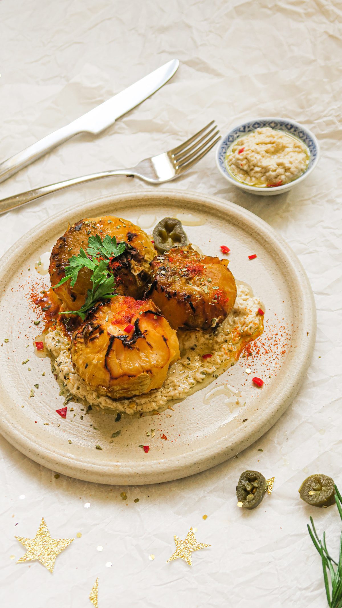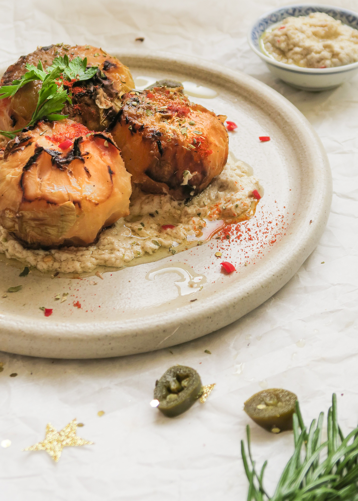 Maak af met een beetje gerookt paprikapoeder, een beetje za’atar, de rode chilipeper, de jalapeno en de verse peterselie.