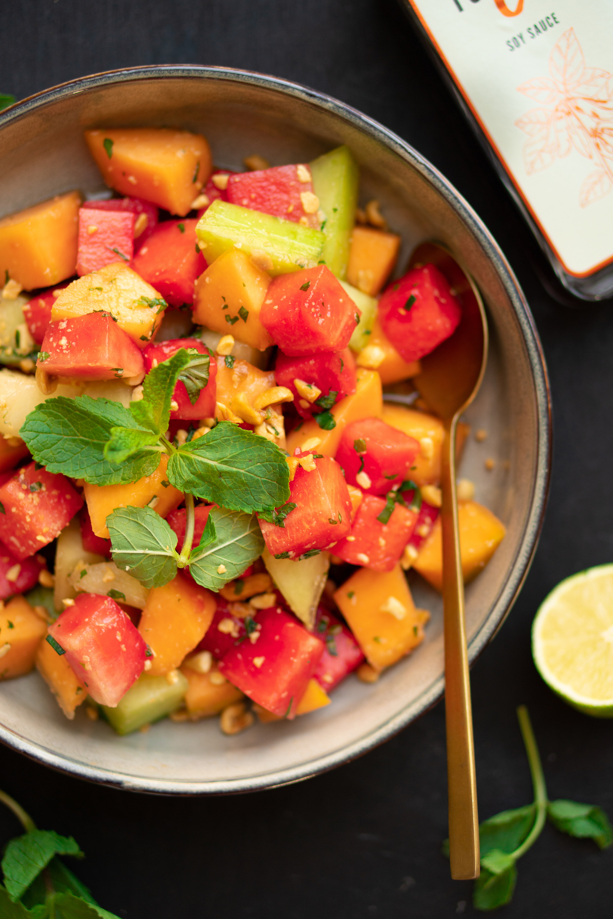 Hartige fruitsalades zijn best populair in Azië. Denk aan de Indonesische roedjak, Maleisische fruitsalade of Thaise fruitsalade. Wij vinden ze superlekker, omdat ze de ideale combinatie zijn tussen zoet en hartig. Kijk maar naar deze Aziatische meloensalade met vissaus, sojasaus, limoen, chilipeper en munt.