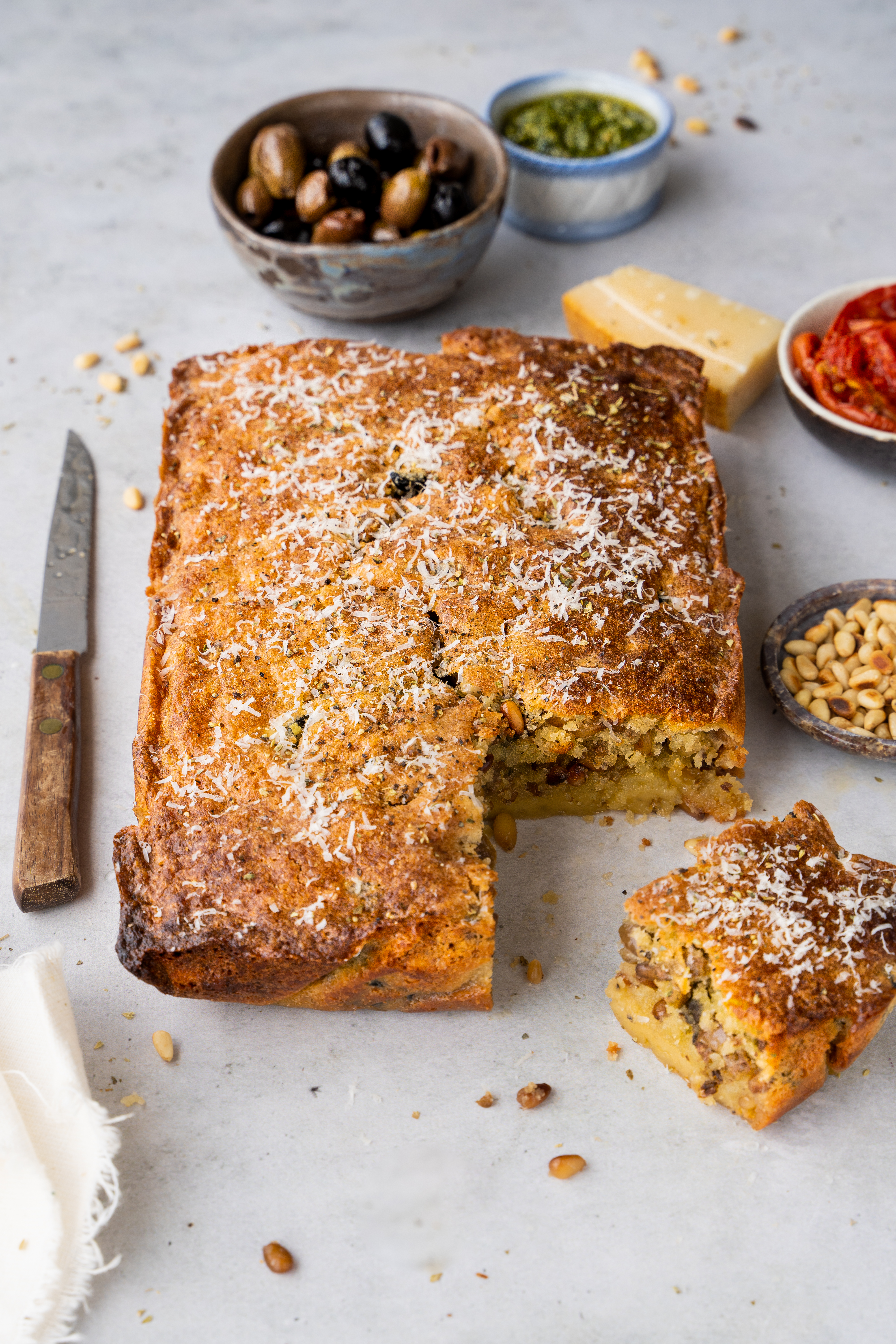 Een ander voordeel: je kunt eindeloos variëren met de vulling. In deze versie spelen olijven en pijnboompitten de hoofdrol, maar ook ingrediënten als zongedroogde tomaatjes, feta, spekjes of gegrilde groenten passen perfect in een hartige cake. Gebruik vooral wat je in huis hebt of waar je op dat moment zin in hebt.