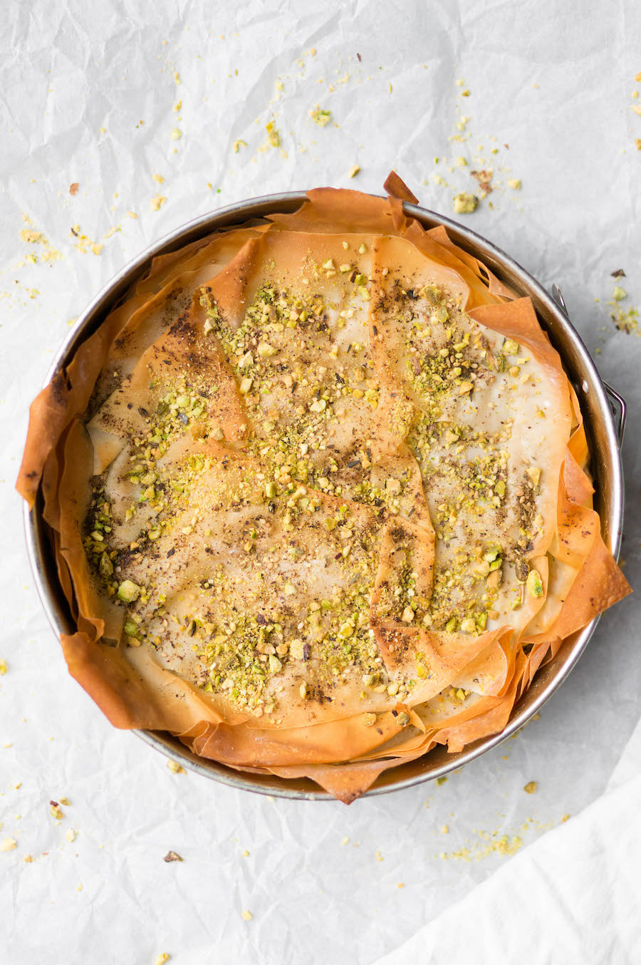Leg een vel filodeeg voorzichtig in de ingevette springvorm. Vet het lichtjes in met wat olie. Leg er een vel bovenop, net iets gedraaid en vet dat ook weer lichtjes in. Herhaal dit tot je een stapeltje van vijf vellen hebt.