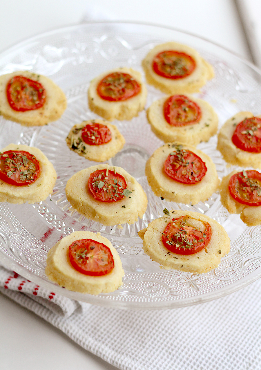 Snijd plakken van de deegrol(len) en leg deze op een met bakpapier beklede bakplaat. Leg op elk koekje een dun plakje cherrytomaat en bestrooi met oregano. 10 tot 12 minuutjes afbakken in de oven, tot de onderkant licht goudbruin is.