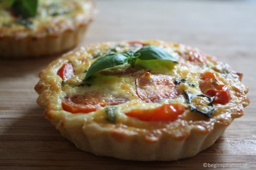 In die tijd bereid je de vulling van de taart voor. Snijd de kerstomaatjes in tweeën en maak een mengsel van slagroom, eieren, knoflook en basilicum. Haal na 15 minuten de bodem uit de oven. Leg dan de kerstomaatjes met het vruchtvlees naar boven op de bodem en giet het eimengsel erover heen. Zet ongeveer 30 minuten in de oven. Laat even afkoelen, want tomaat die rechtstreeks uit de oven komt is heel erg heet!