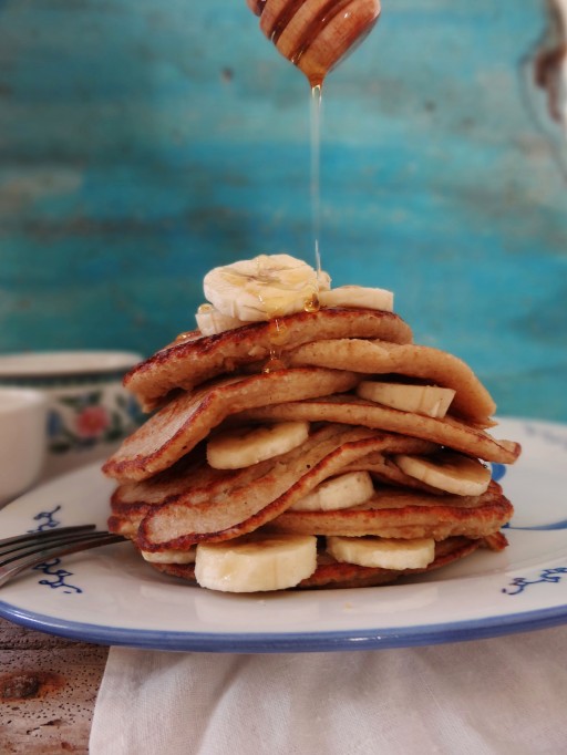 Serveer de pannenkoeken met plakjes banaan, extra honing, eventueel een snuf kaneel en een schepje kwark.