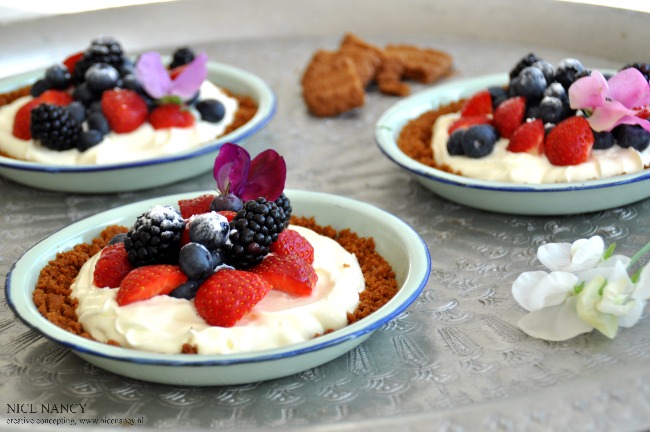 Verkruimel Bastognekoeken, verdeel de kruimels over schaaltjes en overgiet het met wat gesmolten boter. Je merkt vanzelf hoeveel je nodig hebt: het moet de consistentie van nat zand krijgen. Laat dit opstijven in de koelkast.Ā Meng in een kom drie gelijke delen mascarpone, opgeklopte slagroom en de snelle hangop (* zie hieronder). Strooi door het geheel flink wat poedersuiker (of honing) tot het zoet genoeg is. Schep een flinke hoeveelheid van het roommengsel op de koekkruimels. Versier last minute met vers fruit, poedersuiker en eetbare bloemen.