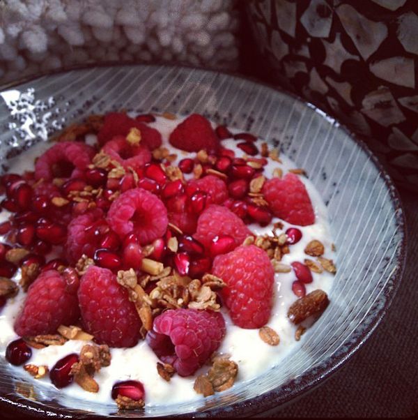 Stap 1: kies je favoriete yoghurt of kwark. Wij gebruikten havermout-yoghurt, maar je kunt alles gebruiken: volle melk yoghurt, magere kwark, sojayoghurt… Neem vervolgens lekker rood fruit, zoals frambozen en granaatappelpitjes. Maak het af met heerlijke granola, zelfgemaakt – lees ons easy granola recept hier – of gekocht. Tip: Marqt verkoopt heerlijke kant-en-klare granola.