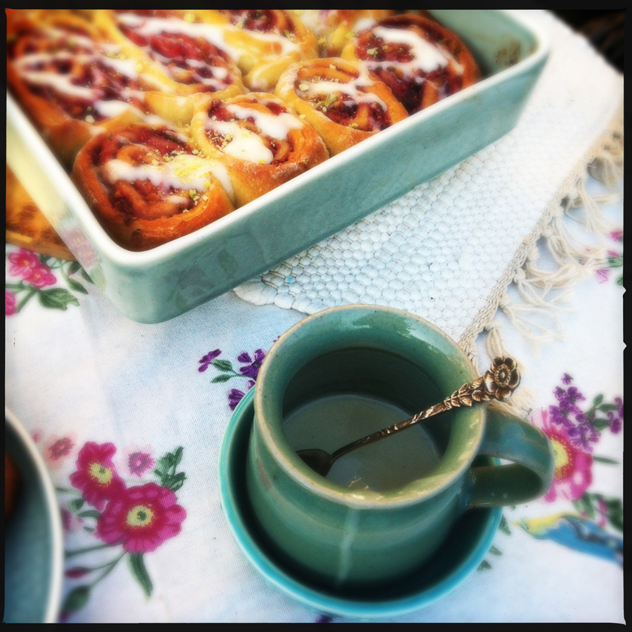 Schenk 2 eetlepels honing over het deeg en verdeel het frambozenmengsel er overheen. Rol het deeg aan de lange kant op totdat er een ‘worst’ ontstaat. Snijd deze in plakken van ongeveer 2,5 cm.
