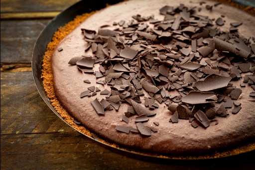 Verdeel de mousse over de speculoosbodem en besprenkel met de chocoladeschilfers. Laat een uurtje opstijven in de koelkast en serveer.