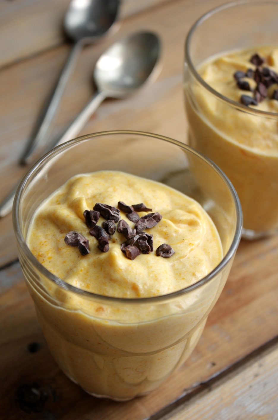 Verdeel je pompoenmousse over zes glaasjes en zet minstens vier uur in de koelkast om goed op te stijven. Serveer met gehakte pure chocolade of raw cacao nibs. Andere serveertip: met een toefje slagroom en verkruimelde gemberkoekjes.
