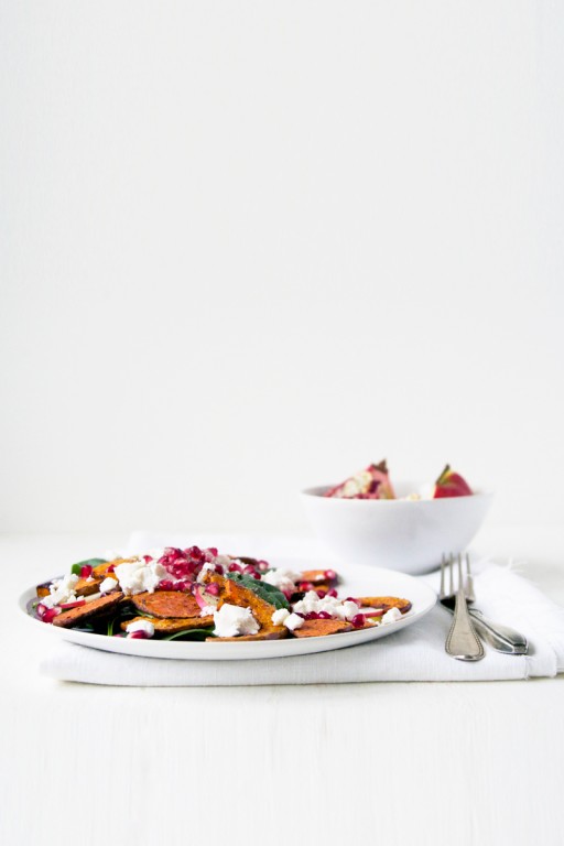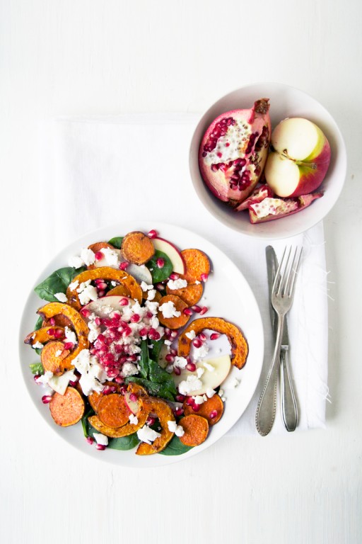Herfstsalade met zoete aardappel, pompoen en geitenkaas