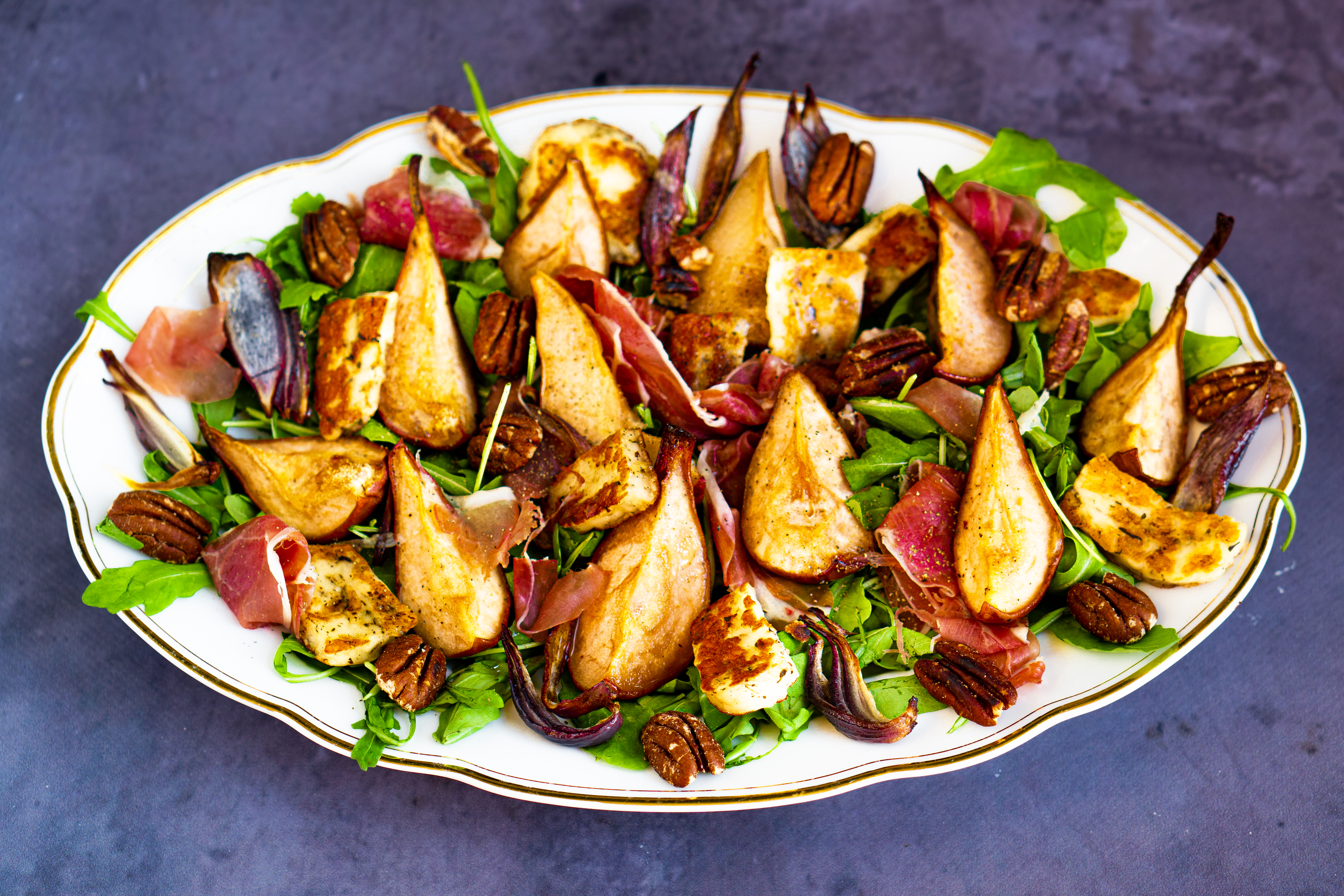 Herfstsalade met hartige stoofpeer, halloumi en parmaham